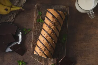 Biskvit izvadi iz pleha i ukloni papir za pečenje. Namaži na njega polovicu kreme. Banane po dužini poredaj uz dva suprotna ruba biskvita. Po dvije sa svake strane. Sada biskvit pažljivo zarolaj oko banana s s obje strane pa spoj kolača fiksiraj kremom. Sada roladi okreni na drugu stranu kako bi taj dio bio dolje, a gornji dio premaži i ukrasi ostatkom čokoladne kreme. Roladu mačje oči reži na šnite i tako je serviraj.