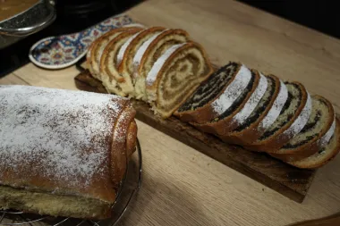 Podijelite tijesto na dva dijela. Razvaljajte svaki na širini lima. Premažite nadjevom od oraha ili maka. Čvrsto zamotajte i ostavite da se diže.
