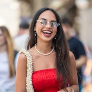 Druga dama koju često viđamo na špici odlučila se za all white modnu kombinaciju. Gornji dio outfita činila je poluprozirna bijela košulja s čipkastim detaljima na rukavima i kragni. Košulja je bila svezana u ležerni čvor koji je outfitu dao razigrani ton. No, glavna zvijezda outfita bila je asimetrična bijela suknja. Čipkasti detalji i volani savršeno su se uklopili u ostatak outfita. Originalna torbica s bijelim perjem i perlicama izgledala je zaista posebno, a bijele sandale na petu s tankim trakicama popularne su i ove sezone.