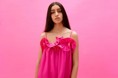 Haljina mini duljine na bretelice i ukrašena volanima. U jarko ružičastoj boji, začinit će svaku kombinaciju.