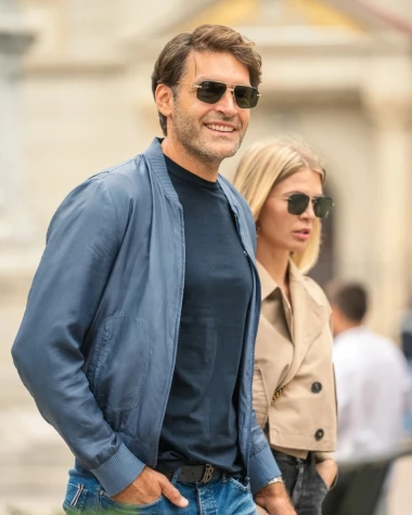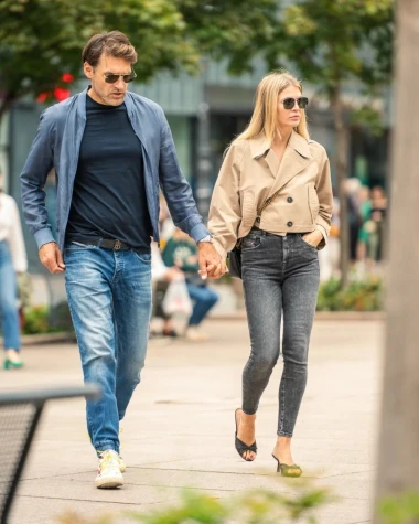 Markantni muškarac odlučio se na sportsku eleganciju u nijansama plave. Traperice ravnog kroja i, muškarac je uskladio s plavom proljetnom jaknom i tamnoplavom majicom kratkih rukava. Sunčane naočale pravokutnih okvira, upotpunile su outfit. Šarmantni par oduševio je jednostavnim i efektnim kombinacijama.